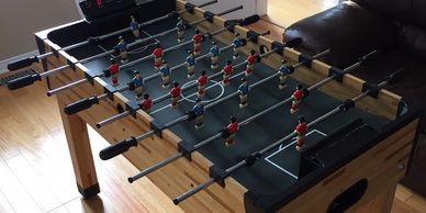 4 foot Foosball table with electronic scoreboard. Set the timer for 1, 2, 3, 4 or 5 minute challenge. Red vs. Blue and remember… no spinning!