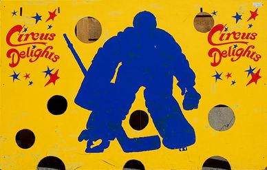 Players with hockey sticks attempt to shoot tennis balls through holes randomly cut around the large silhouette of a goaltender. The target measures 8’x4′.